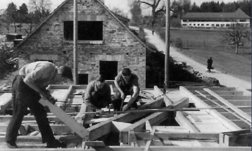 | Im Jahre 1946 wurde das Siedlungsprojekt vom Architekten-Ehepaar Reinhard in die Tat umgesetzt. Gebaut wurde mit Hammer und Händen. Die finanziellen Möglichkeiten waren sehr begrenzt. Im August 1947 stand dann die fertige Siedlung zum Bezug bereit. Der Anfangsmietzins für eine Einheit betrug damals ca. 150 Franken im Monat. |